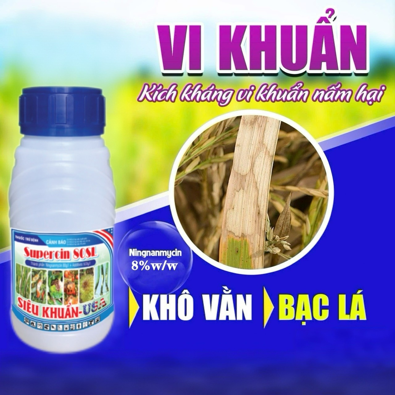 Supercin 80SL là thuốc trừ bệnh sinh học chuyên dùng để trị bạc lá lúa. Với hoạt chất Ningnanmycin, thuốc có khả năng ức chế nhanh vi khuẩn Xanthomonas oryzae, làm ngừng lan rộng các vết cháy trắng trên lá. Khi phun, thuốc thấm sâu vào mô lá, giúp giảm mạnh mật độ vi khuẩn, bảo vệ diện tích lá xanh còn lại và hạn chế thất thu năng suất.